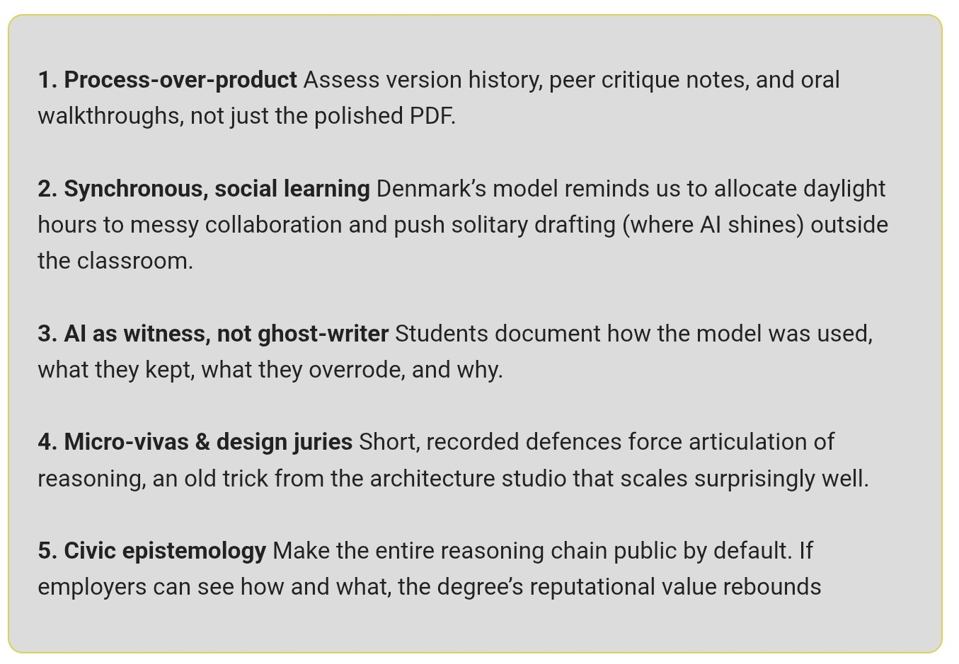 Du er ekspert på kunnskapsforvaltning og høyere utdanning. Lag design for en sammensatt eksamensform med flere formater og elementer. Dette designet, som kombinerer ulike formater, skal hindre studentene i å framstille seg som dyktigere enn de er og skal demonstrere deres faktiske kunnskap, problemløsende evne og formidlingsferdighet.